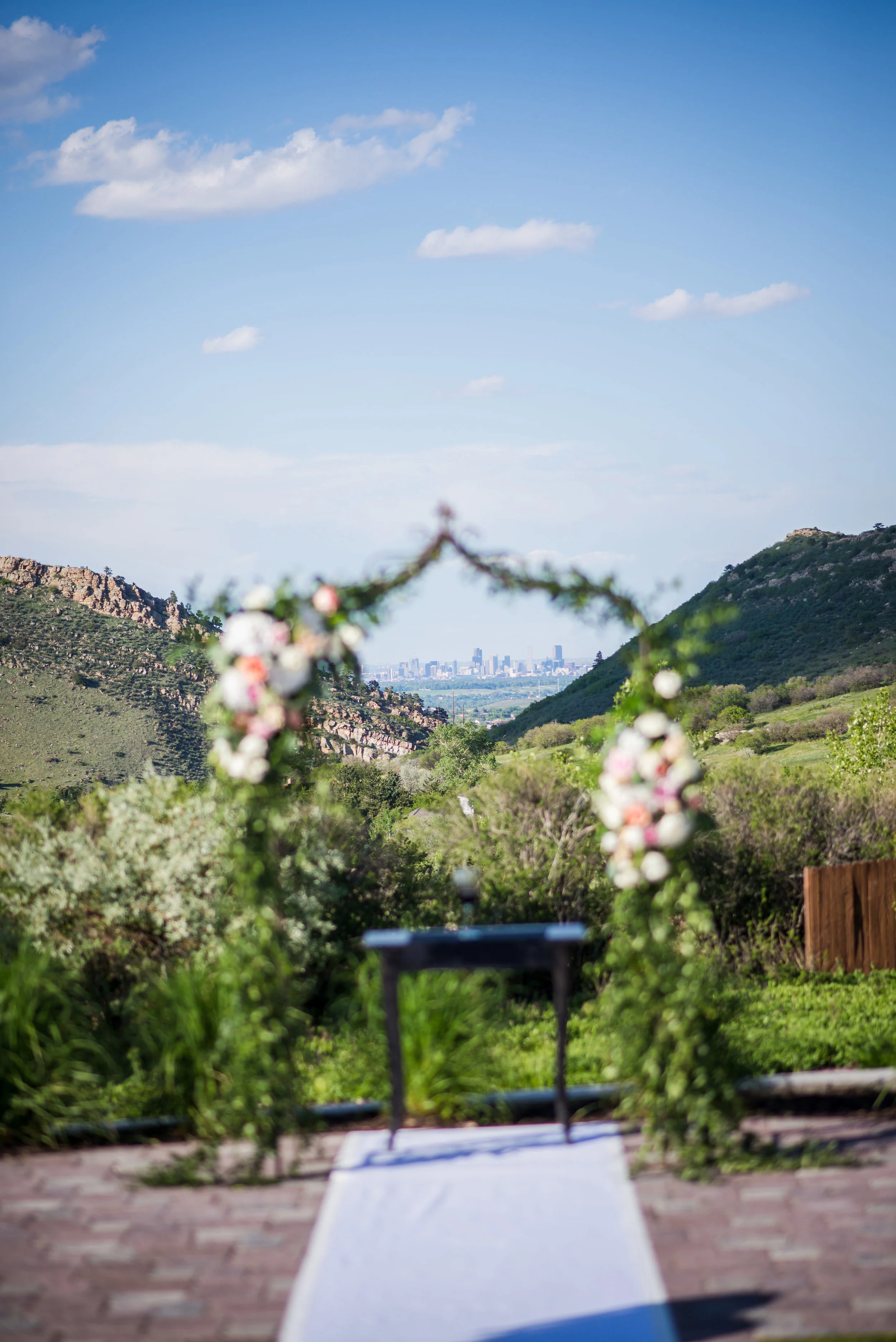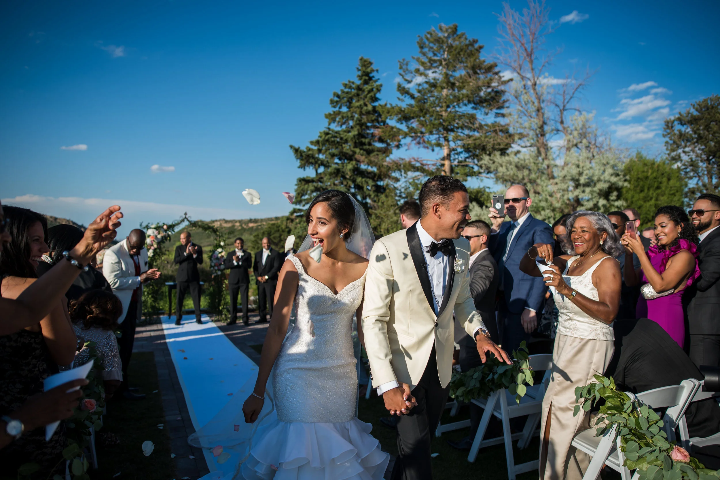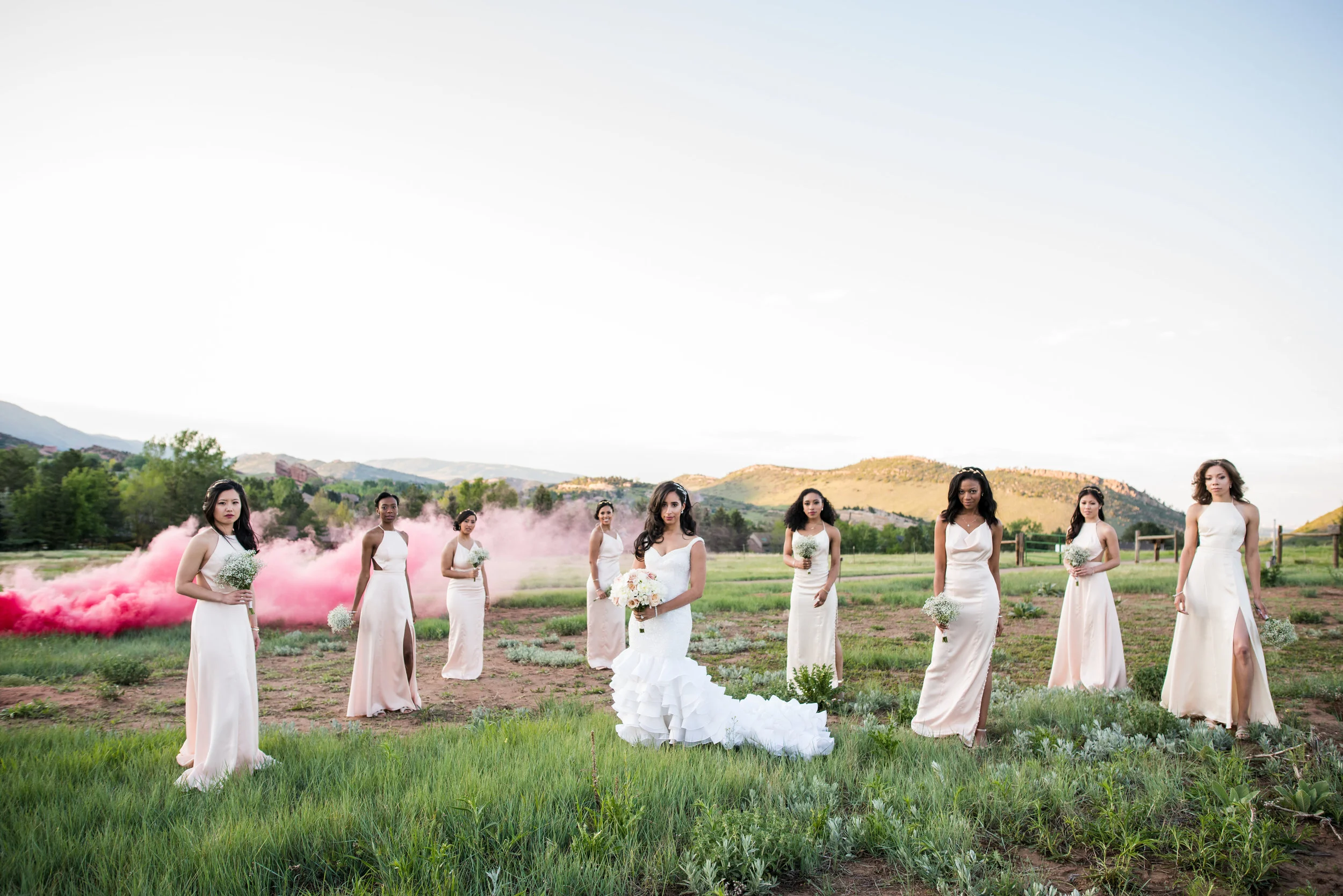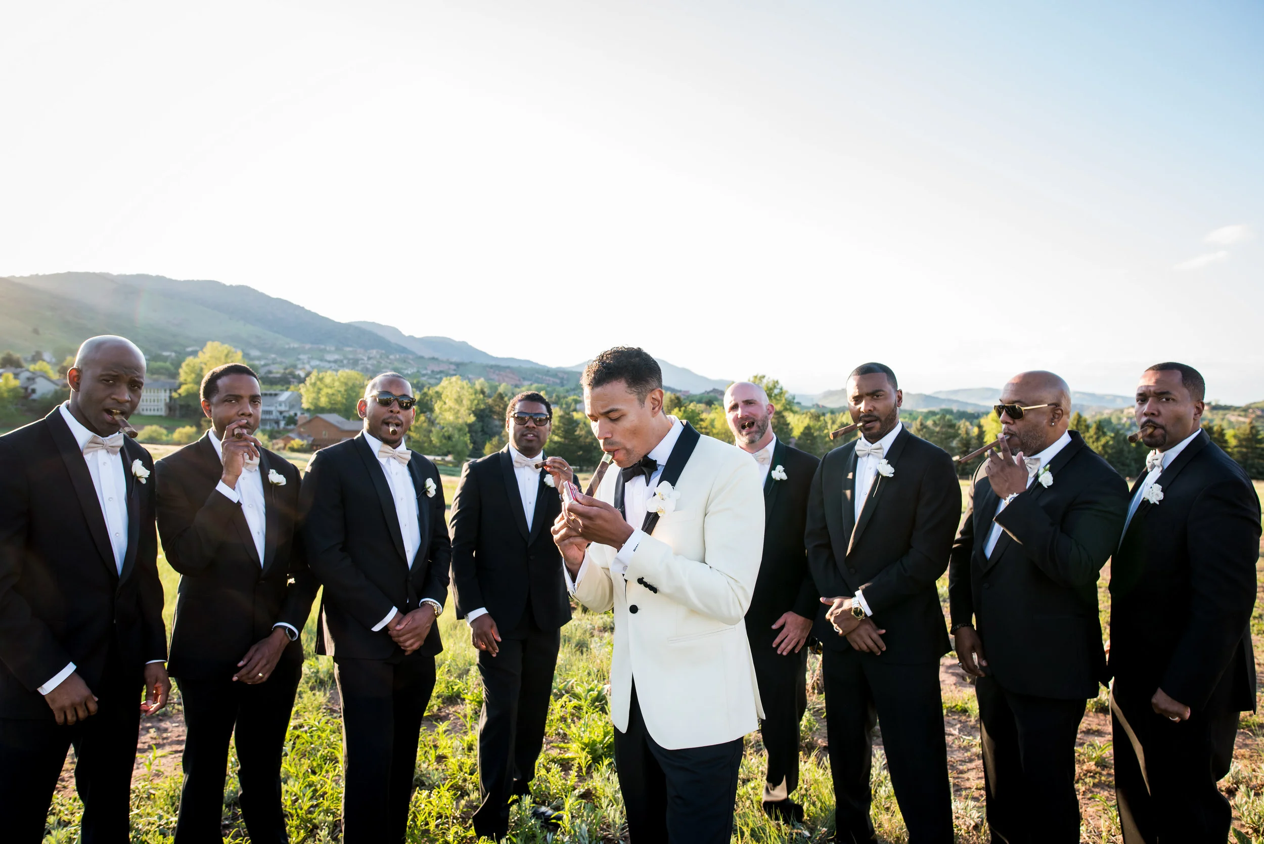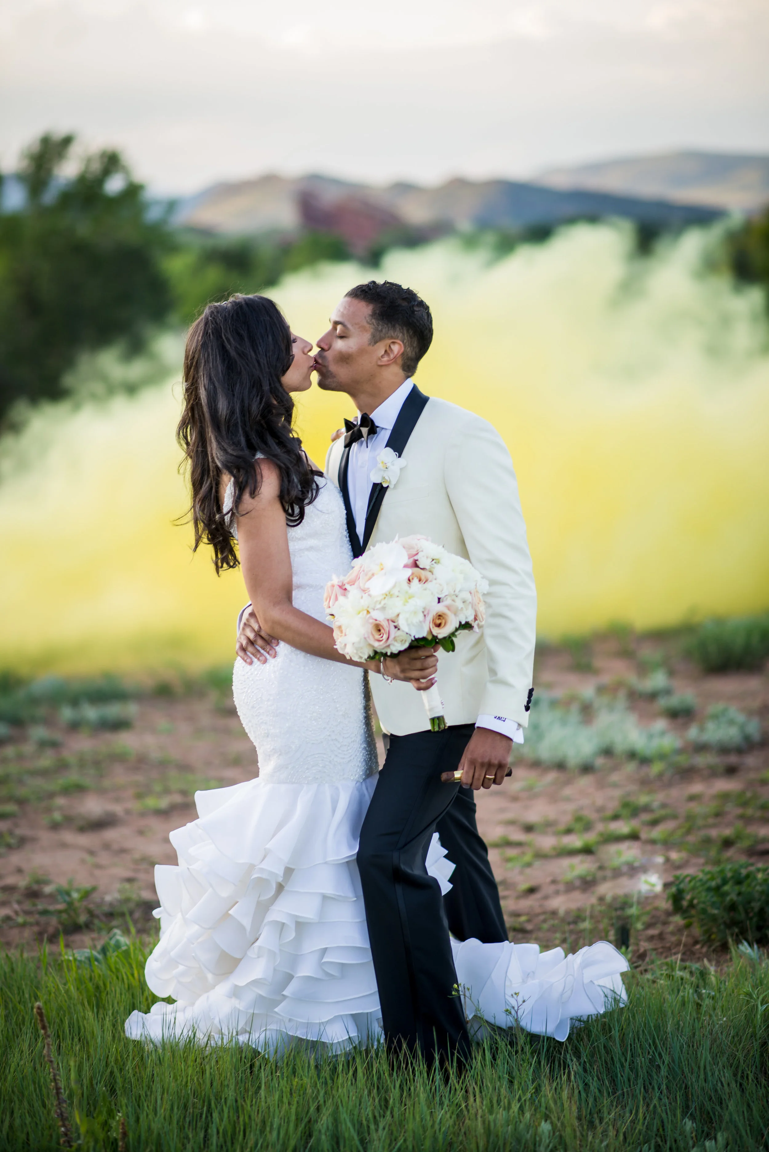 Jonathan proposed to Crystal on New Years Eve in the middle of Time Square with an Emerald engagement ring. With the whole thing caught on film with a secret photo shoot. You can say that he has a flair for the extravagant and we ran with that! After meeting this New York couple with big personality we could not wait to get started. The couple was married at The Manor House on May 29, 2017. This special day began the night before with an all girl sleepover at The Manor House's on site guesthouse. The ladies woke up and got ready in their robes gifted by the bride. In the mean time, the guys got ready in The Man Cave in the basement of The Manor House. As guests arrived, they were seated on the backyard terrance for the ceremony and were greeted by the sounds of Mary Keener's Harp. There was an asymmetrically decorated arch that perfectly framed the city of Denver in the distance and the aisle was lined with floral garland. The couple opted not to do a first look and saw each other for the very first time as Crystal walked down the long winding aisle to Jonathan. It was an emotional entrance as she was escorted by her father in her beautiful cathedral style veil. The couple was married by Crystals mentor in a religious ceremony. Both Jonathan and Crystal wrote their own vows to each other that were fun and yet heartfelt. After the couple said I do guests threw flower petals in celebration. Cocktail hour was on the front porch of the house where they enjoyed cocktail, appetizers, and jazz music by three of the members of The Diamond Empire Band. The bridal party snuck into the field for photos where they used colored smoke bombs to create some dramatic and amazing photos. The ball room was decorated with varying heights of lush centerpieces and candles created by Newberry Brothers. The wooden beans on the ceiling were draped in a greenery garland and twinkle lights. The theme of the wedding was to be a lush garden and when the team was done it was exactly that. The whole bridal party was introduced into the reception and the newlyweds went straight into their first dance which started as a slow song and ended with them breaking into a dance to "I Like to Cha Cha". The guests enjoyed a dinner of Roasted Duck Breast with Apricot Chutney and Maple Sriracha Salmon provided by the onsite catering staff. The night went on with toasts and the cutting of the stunning Chocolate Dulce De Leche Cake provided by Azucar Bakery. We just cant get over this hand crafted sugar flower. Because of Jonathan's love for cigars the couple flew in a cigar roller all the way from Miami to hand roll cigars for the night. Each cigar had a gold label around it with the couples family crest and their wedding date. It was such a nice personal touch and the cigars were a big hit with this fun group. The couple ended the night with their big send off as they rolled away in a vintage Rolls Royce.