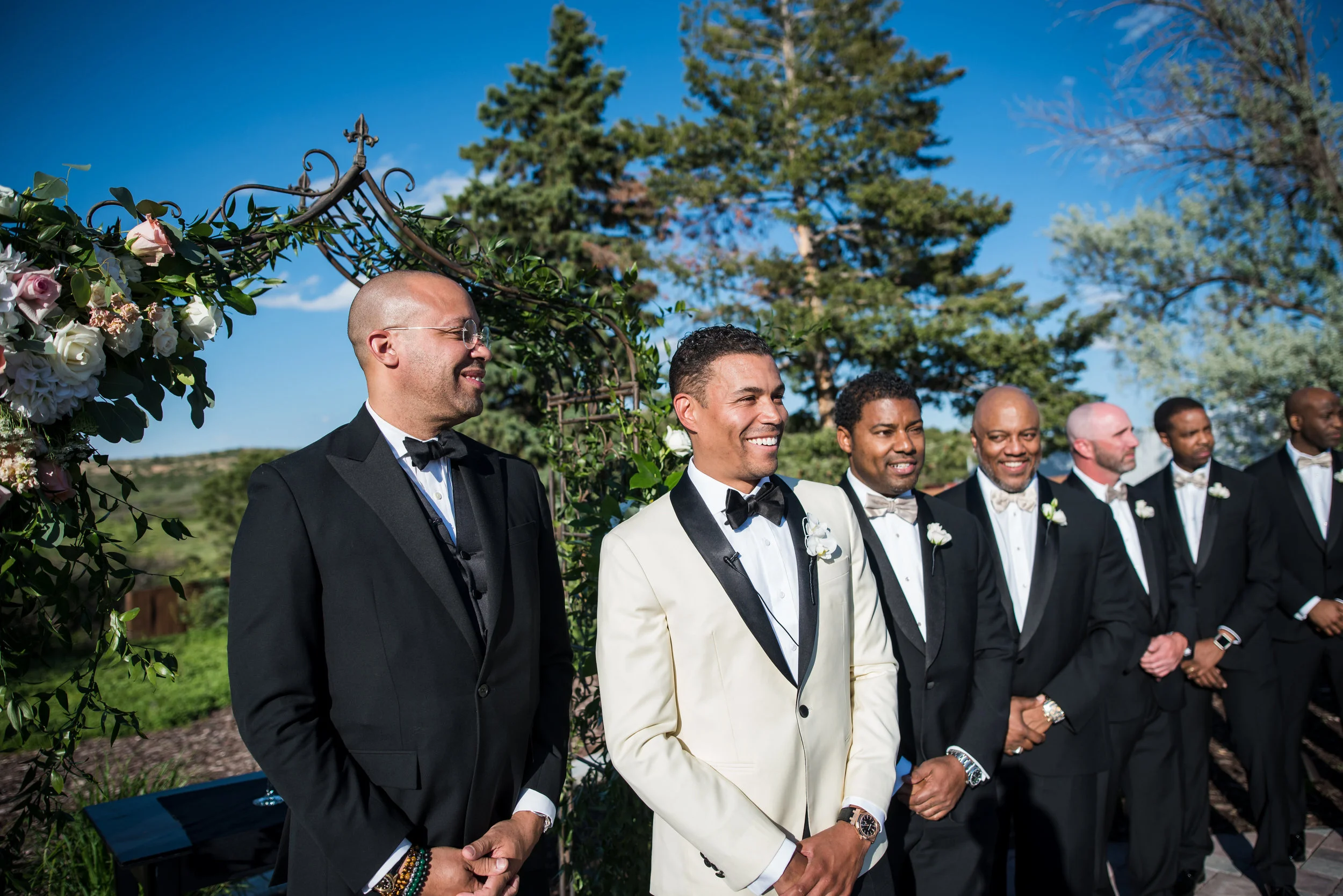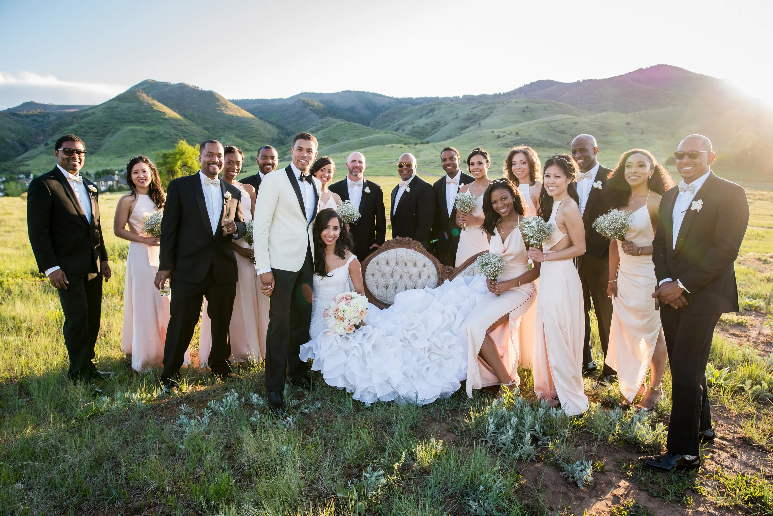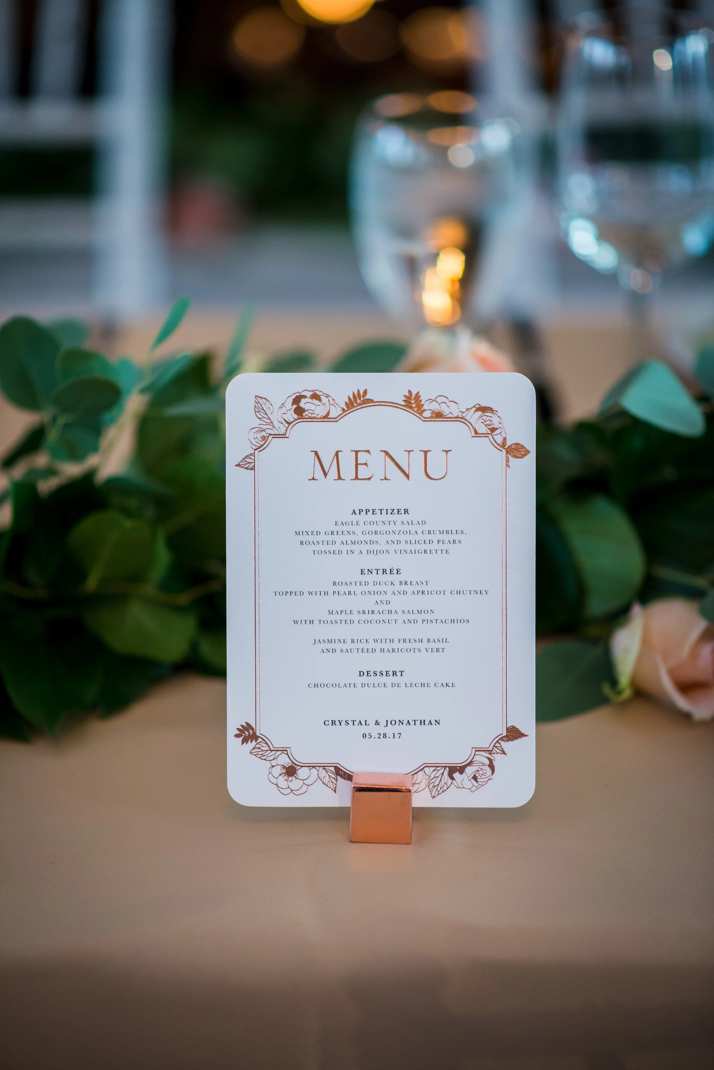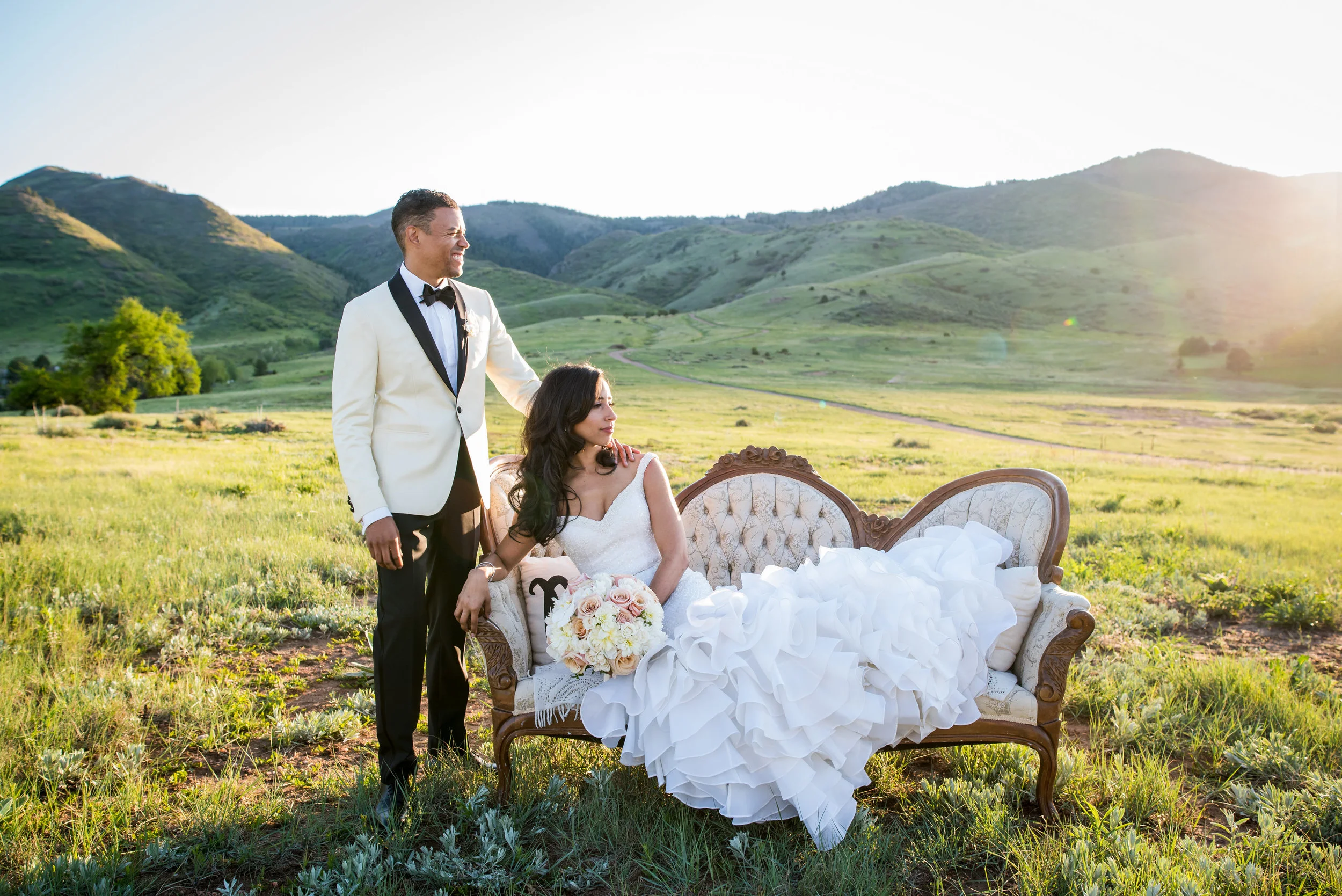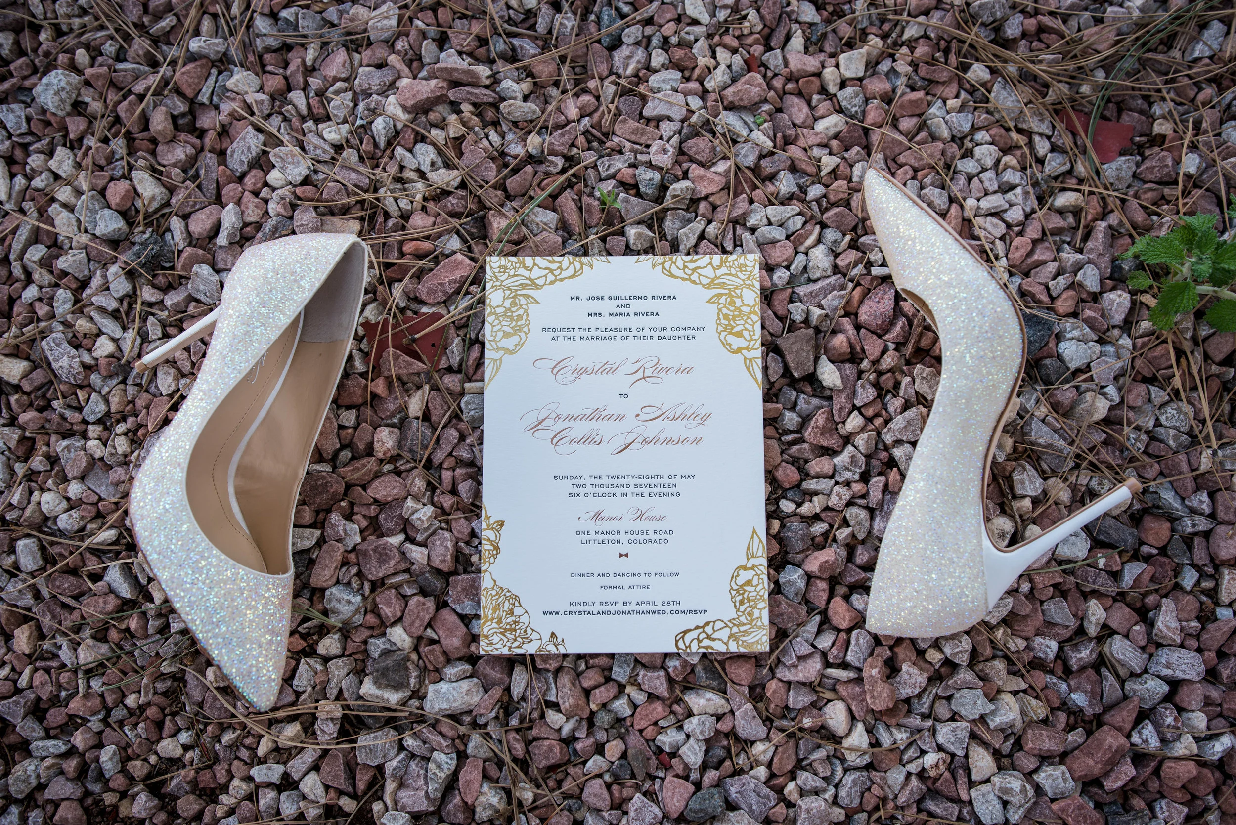 Jonathan proposed to Crystal on New Years Eve in the middle of Time Square with an Emerald engagement ring. With the whole thing caught on film with a secret photo shoot. You can say that he has a flair for the extravagant and we ran with that! After meeting this New York couple with big personality we could not wait to get started. The couple was married at The Manor House on May 29, 2017. This special day began the night before with an all girl sleepover at The Manor House's on site guesthouse. The ladies woke up and got ready in their robes gifted by the bride. In the mean time, the guys got ready in The Man Cave in the basement of The Manor House. As guests arrived, they were seated on the backyard terrance for the ceremony and were greeted by the sounds of Mary Keener's Harp. There was an asymmetrically decorated arch that perfectly framed the city of Denver in the distance and the aisle was lined with floral garland. The couple opted not to do a first look and saw each other for the very first time as Crystal walked down the long winding aisle to Jonathan. It was an emotional entrance as she was escorted by her father in her beautiful cathedral style veil. The couple was married by Crystals mentor in a religious ceremony. Both Jonathan and Crystal wrote their own vows to each other that were fun and yet heartfelt. After the couple said I do guests threw flower petals in celebration. Cocktail hour was on the front porch of the house where they enjoyed cocktail, appetizers, and jazz music by three of the members of The Diamond Empire Band. The bridal party snuck into the field for photos where they used colored smoke bombs to create some dramatic and amazing photos. The ball room was decorated with varying heights of lush centerpieces and candles created by Newberry Brothers. The wooden beans on the ceiling were draped in a greenery garland and twinkle lights. The theme of the wedding was to be a lush garden and when the team was done it was exactly that. The whole bridal party was introduced into the reception and the newlyweds went straight into their first dance which started as a slow song and ended with them breaking into a dance to "I Like to Cha Cha". The guests enjoyed a dinner of Roasted Duck Breast with Apricot Chutney and Maple Sriracha Salmon provided by the onsite catering staff. The night went on with toasts and the cutting of the stunning Chocolate Dulce De Leche Cake provided by Azucar Bakery. We just cant get over this hand crafted sugar flower. Because of Jonathan's love for cigars the couple flew in a cigar roller all the way from Miami to hand roll cigars for the night. Each cigar had a gold label around it with the couples family crest and their wedding date. It was such a nice personal touch and the cigars were a big hit with this fun group. The couple ended the night with their big send off as they rolled away in a vintage Rolls Royce.